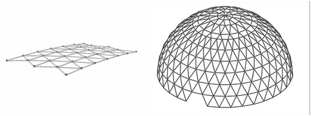 Spherical domes and other compound curves usually require the use of tetrahedral modules or pyramids and additional support from a skin.